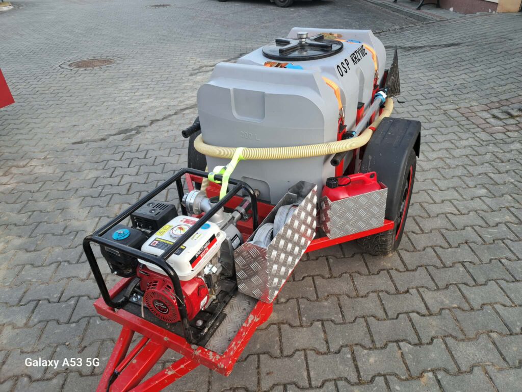 Na dwuosiowej przyczepce znajduje się moduł gaśniczy. W jego skład wchodzi zbiornik na wodę o pojemności 350 litrów, motopompa o wydajności 300 litrów na minutę, dwa odcinki węża W25 wraz z prądownicą, dwie tłumice, wąż ssawny i zbiornik na paliwo o pojemności 4 litrów.