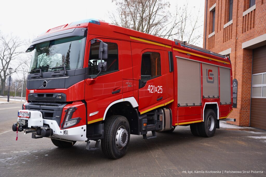 Pierwszy z nich to ciężki samochód ratowniczo – gaśniczy Volvo, który posiada zbiornik na wodę o pojemności 5000 litrów, zbiornik na środek pianotwórczy o pojemności 500 litrów i autopompę o wydajności 4700 l/min, wciągarkę linową, działko wodno-pianowe, linię szybkiego natarcia oraz maszt oświetleniowy. Kosztował ponad 1,6 mln zł, a jego zakup został sfinansowany z dotacji WFOŚiGW i wpłat samorządów z terenu powiatu.