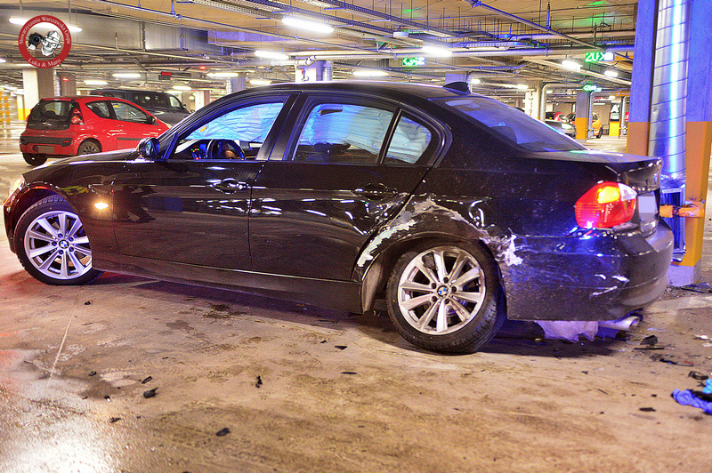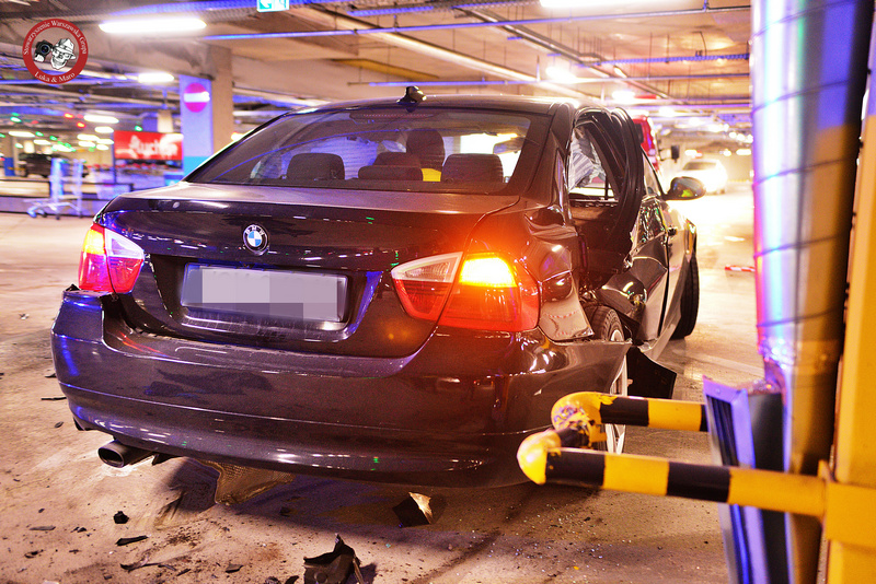 Siła uderzenia była ogromna. BMW z impetem zostało zepchnięte w betonowy filar podtrzymujący strop parkingu. Widok roztrzaskanego auta wbitego w słup mógł mrozić krew w żyłach. Na miejsce natychmiast zadysponowano wszystkie służby ratunkowe.