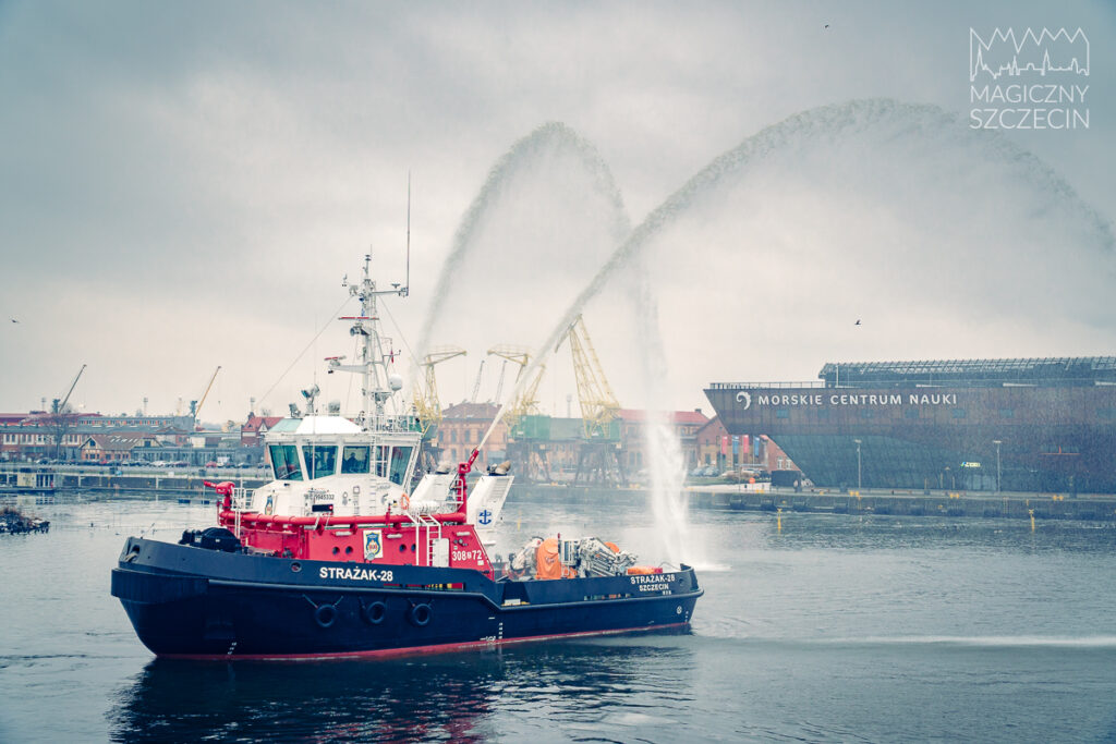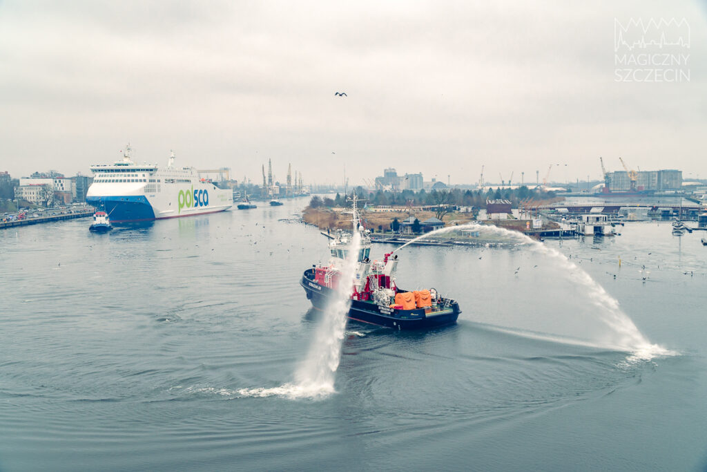 W Szczecinie Jantar został powitany tradycyjnym salutem wodnym wykonanym przez statek pożarniczy STRAŻAK-28.