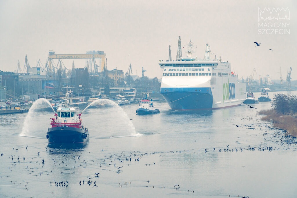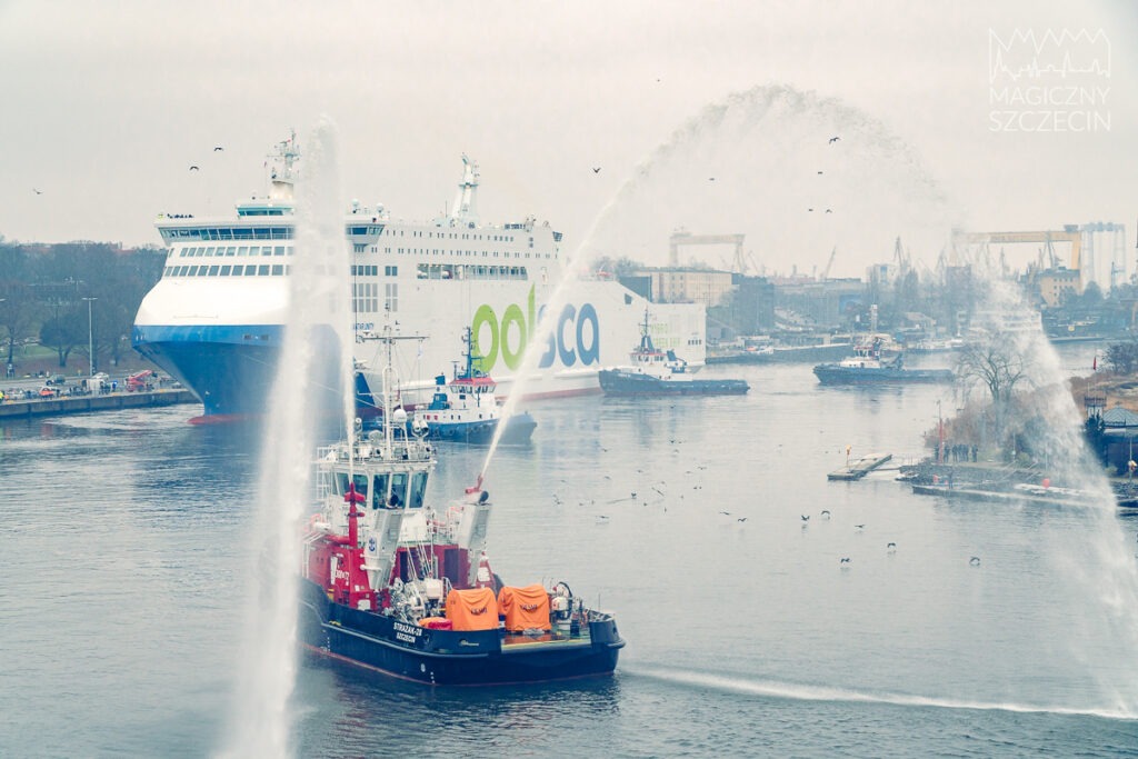 W Szczecinie zacumował najnowocześniejszy prom na Bałtyku. Jantar Unity został powitany przez Portową Straż Pożarną Portu Szczecin-Świnoujście.
