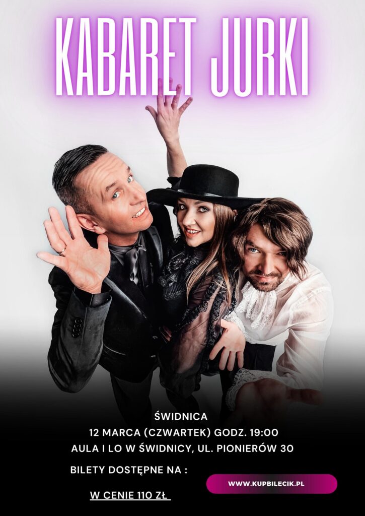 Jeden z najbardziej znanych i lubianych kabaretów ,,JURKI”, będzie gościł w naszym mieście już 12 marca ( czwartek) o godz. 19:00, gdzie da popis swoich możliwości artystycznych w Auli I LO, w Świdnicy, przy ul. Pionierów 30.