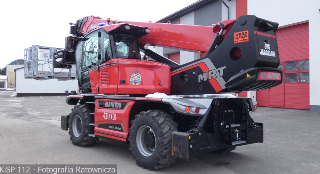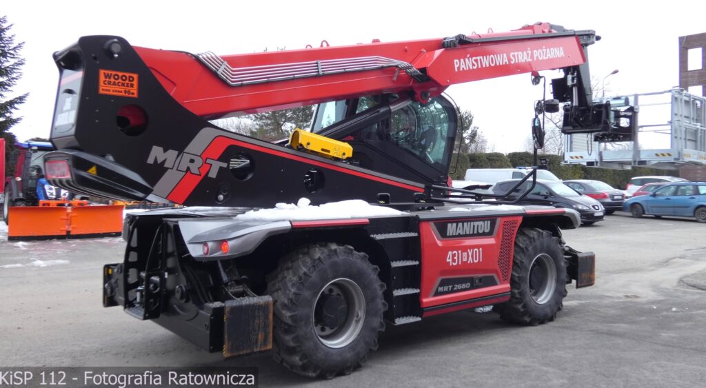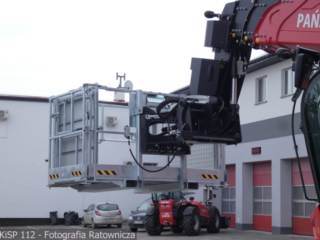 Nowy nabytek strażaków to Manitou MRT 2660, czyli połączenie trzech maszyn w jednej – ładowarki teleskopowej, dźwigu i podnośnika koszowego.