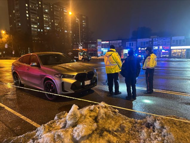 Policja na miejscu wypadku w North York, w którym pieszy został potrącony przez samochód, którego kierowca pozostał na miejscu zdarzenia.