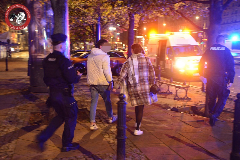 W tym samym czasie w pobliżu przejeżdżał policyjny patrol jadący do wypadku radiowozu, który miał miejsce niedaleko. Gdy funkcjonariusze znaleźli się w rejonie Marszałkowskiej 58, z okien feralnego mieszkania w ich kierunku poleciały butelki. Jedna z nich trafiła w osobę postronną znajdującą się na chodniku. Ze wstępnych informacji wynika, iż poszkodowana osoba została ranna i przewieziona do szpitala, choć informacji tej nie udało się jeszcze oficjalnie potwierdzić.