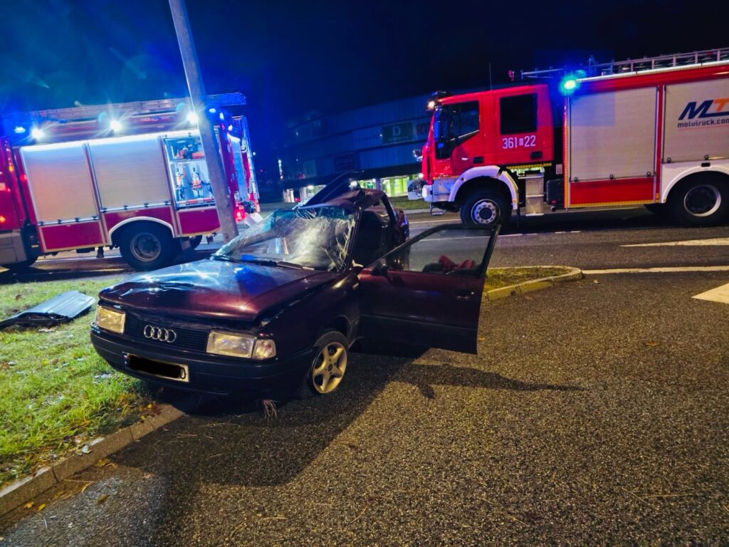 Około 20-letni kierujący audi jadąc w kierunku rondo Witolda Lutosławskiego stracił panowanie nad pojazdem i bokiem uderzył w latarnię. Samochodem podróżowały cztery osoby.