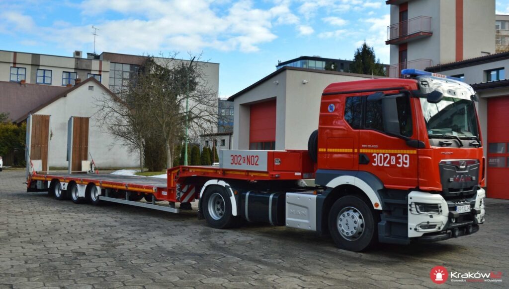 Foto. Krakow112.plDo transportu pojazdu wykorzystywana będzie naczepa niskopodwoziowa, która niedawno trafiła do jednostki.