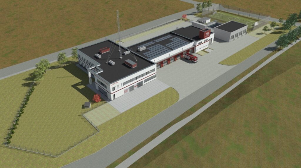 Budynek ma mieć halę garażową na czternaście pojazdów wraz z magazynami i stanowiskiem do obsługi AOUO oraz wydzielone części dla Jednostki Ratowniczo – Gaśniczej i Komendy Powiatowej PSP. Ponadto powstanie boisko wielofunkcyjne i kontenerowy obiekt ćwiczebny.