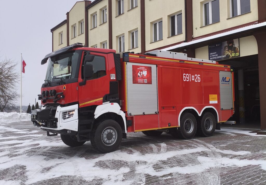 Na wyposażenie Jednostki Ratowniczo – Gaśniczej w Wyszkowie trafił ciężki samochód ratowniczo – gaśniczy zabudowany przez firmę Moto-Truck na trzyosiowym podwoziu Renault HD009K 6×6.