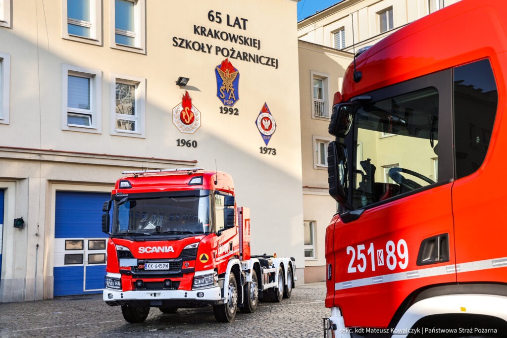 Szkoła Aspirantów PSP w Krakowie została doposażona w dwa nowe ciężkie samochody – nośniki kontenerów wraz z przyczepami.