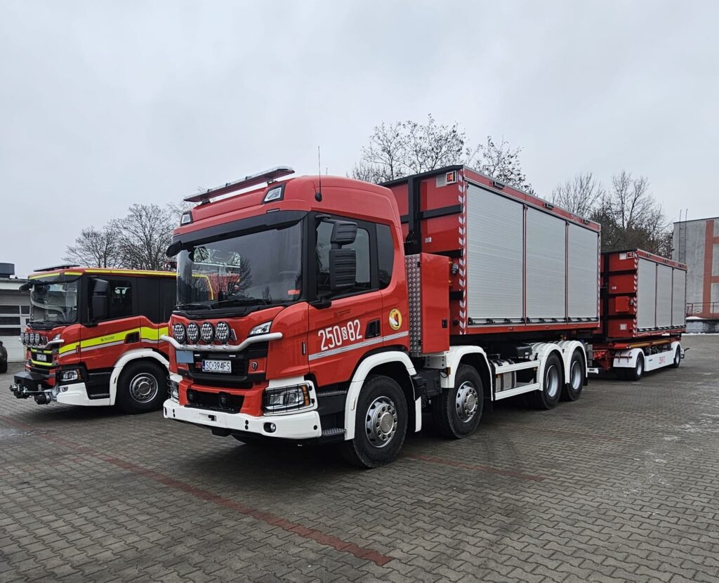 Dzięki Programowi Ochrony Ludności i Obrony Cywilnej Centralna Szkoła PSP w Częstochowie wzbogaciła się o nośnik kontenerów i dwa nowe kontenery.