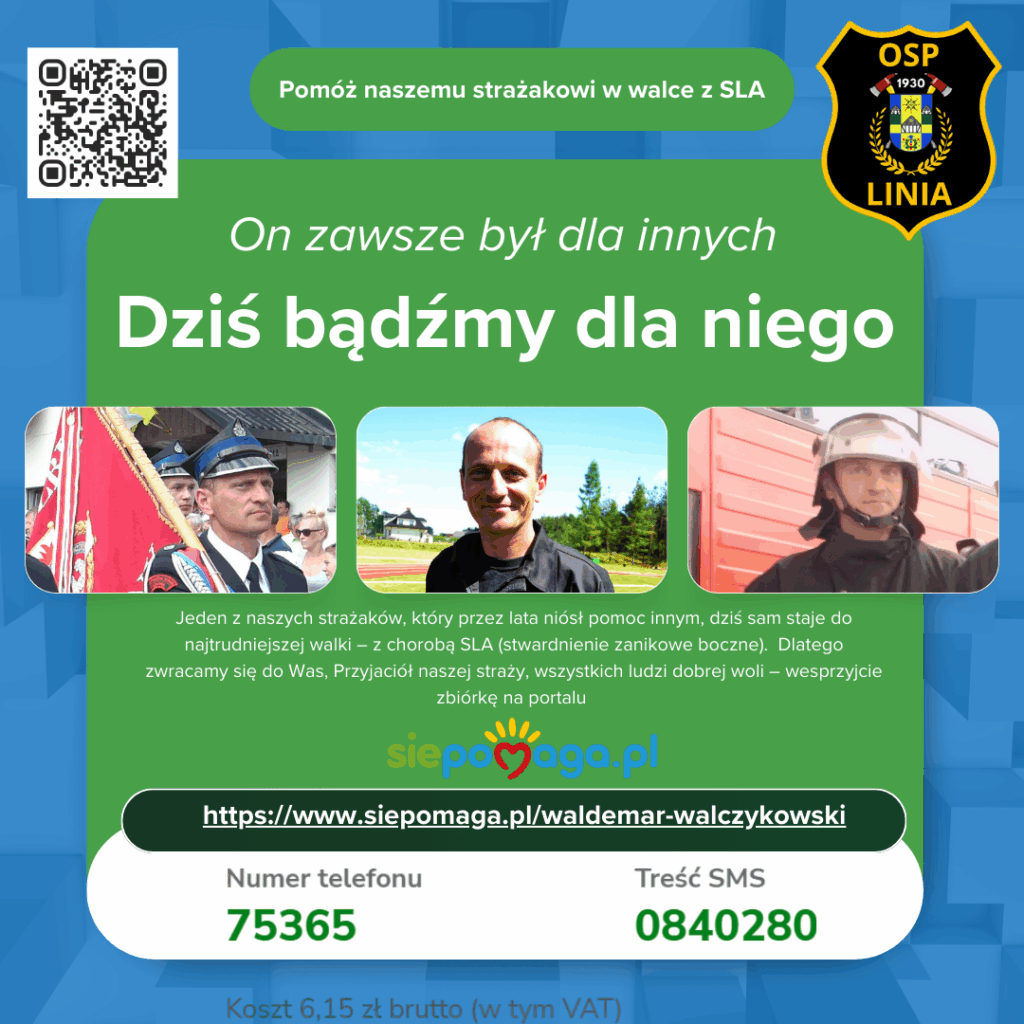 Od ponad 25 lat zawsze był tam, gdzie ktoś potrzebował pomocy. W ogniu, w deszczu, w środku nocy – gotów, by nieść ratunek. Dziś to on potrzebuje wsparcia. Waldemar Walczykowski, strażak ochotnik z OSP Linia, walczy z bezlitosną chorobą – SLA. A jego druhowie, przyjaciele i cała społeczność gminy Linia ruszyli do akcji. Bo strażaków łączy coś więcej niż mundur – łączy ich braterstwo.