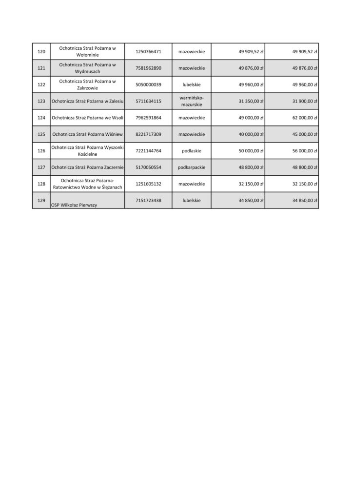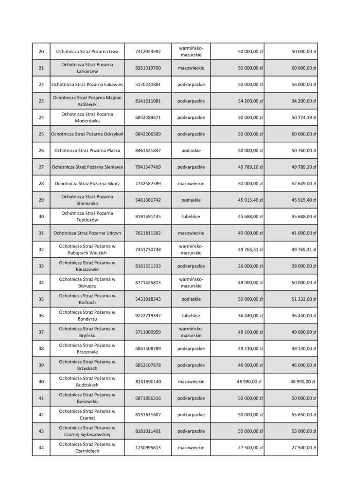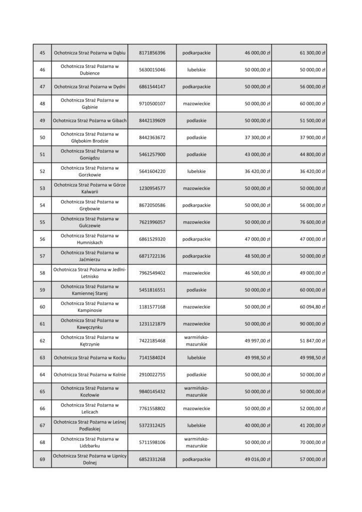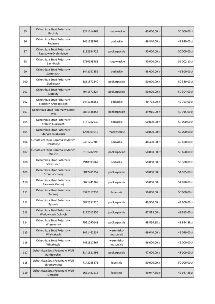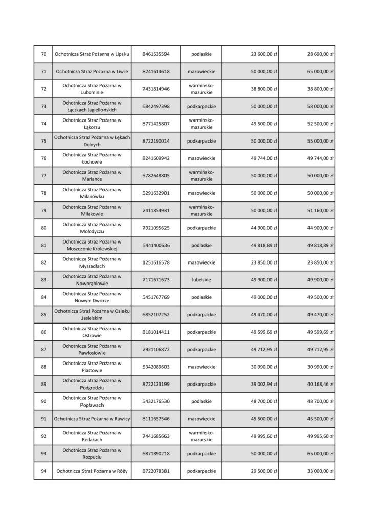 W ramach pilotażu ORLEN przeznacza 5 milionów złotych dla jednostek OSP z województw: warmińsko-mazurskiego, podlaskiego, mazowieckiego, lubelskiego i podkarpackiego. Do 8 października mogą one wnioskować o granty do 50 tys. zł. na zakup środków ochrony indywidualnej, sprzętu logistycznego, bezzałogowych statków powietrznych (np. dronów), środków łączności, czy na szkolenia.