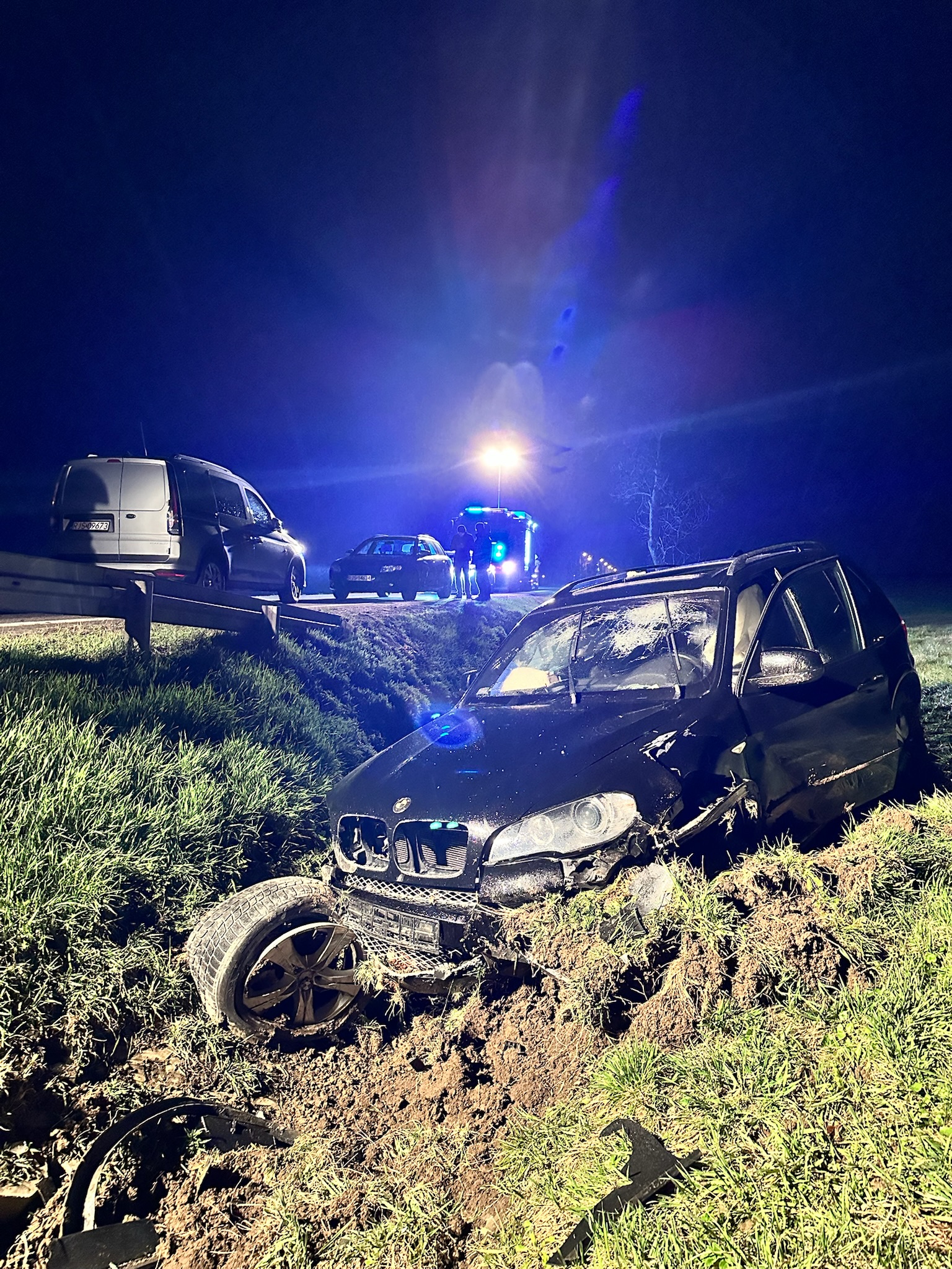 W wyniku kolizji BMW zostało zepchnięte z drogi, uderzyło w mostek i wpadło do przydrożnego rowu.