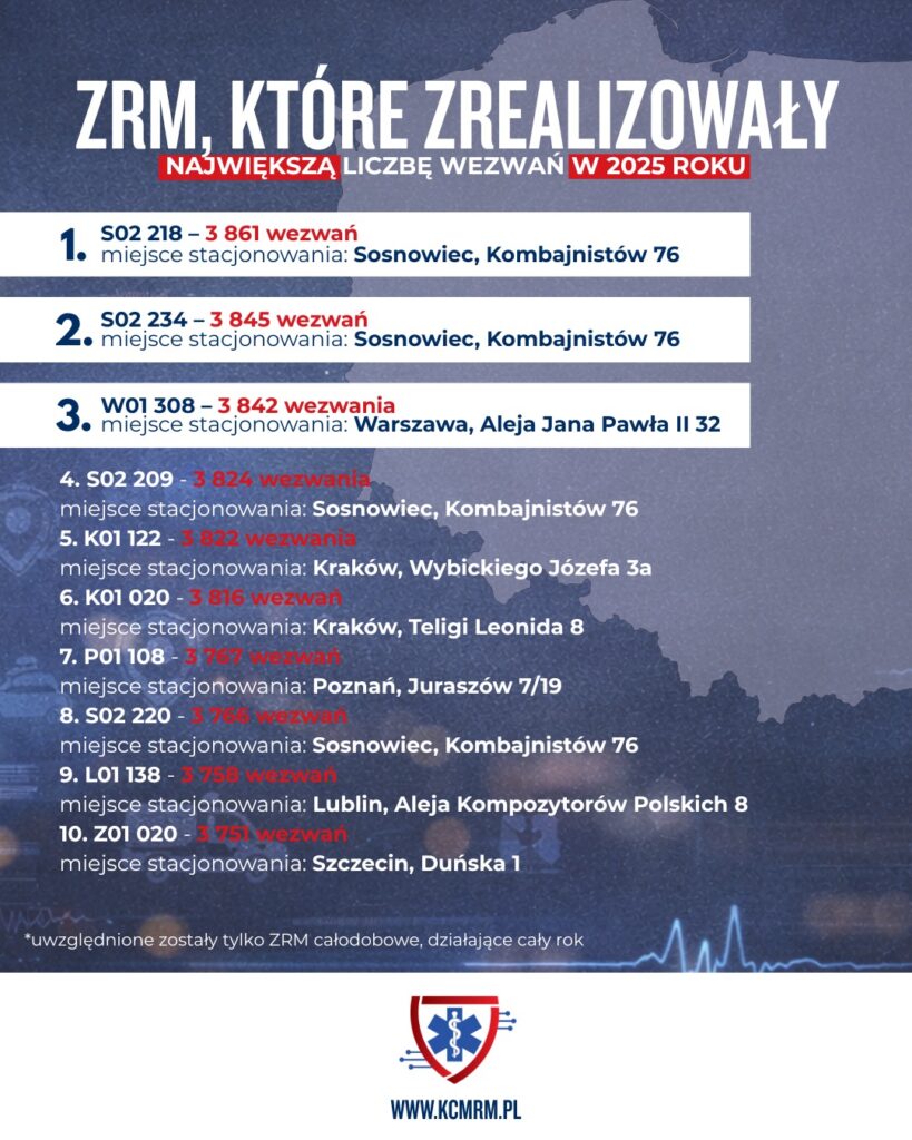 W 2025 roku największą liczbę wezwań zrealizowały Zespoły Ratownictwa Medycznego S02 218 i S02 234 stacjonujące przy ulicy Kombajnistów w Sosnowcu, odpowiednio 3861 i 3845 wezwań. Na trzecim miejscu znalazł się ZRM W01 308 z Warszawy, który zrealizował 3842 wezwań.