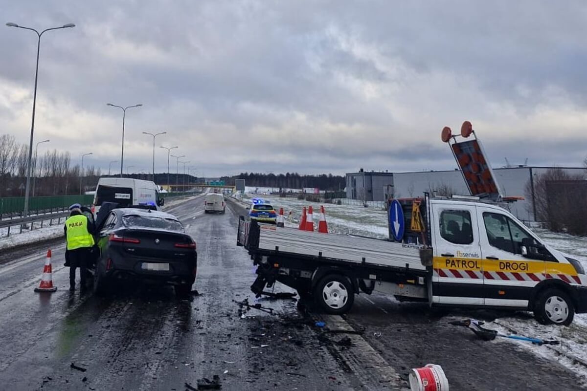 BMW wpadło w poślizg i uderzyło w pojazd służb drogowych