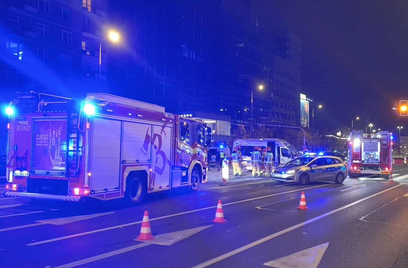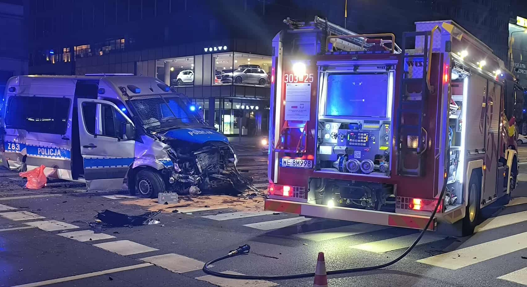 Świadkowie mówią o silnym uderzeniu — cały przód radiowozu został zniszczony. Na miejscu pracują strażacy, policja i pogotowie. Z ruchu wyłączono jeden pas, co powoduje spore utrudnienia w centrum miasta.