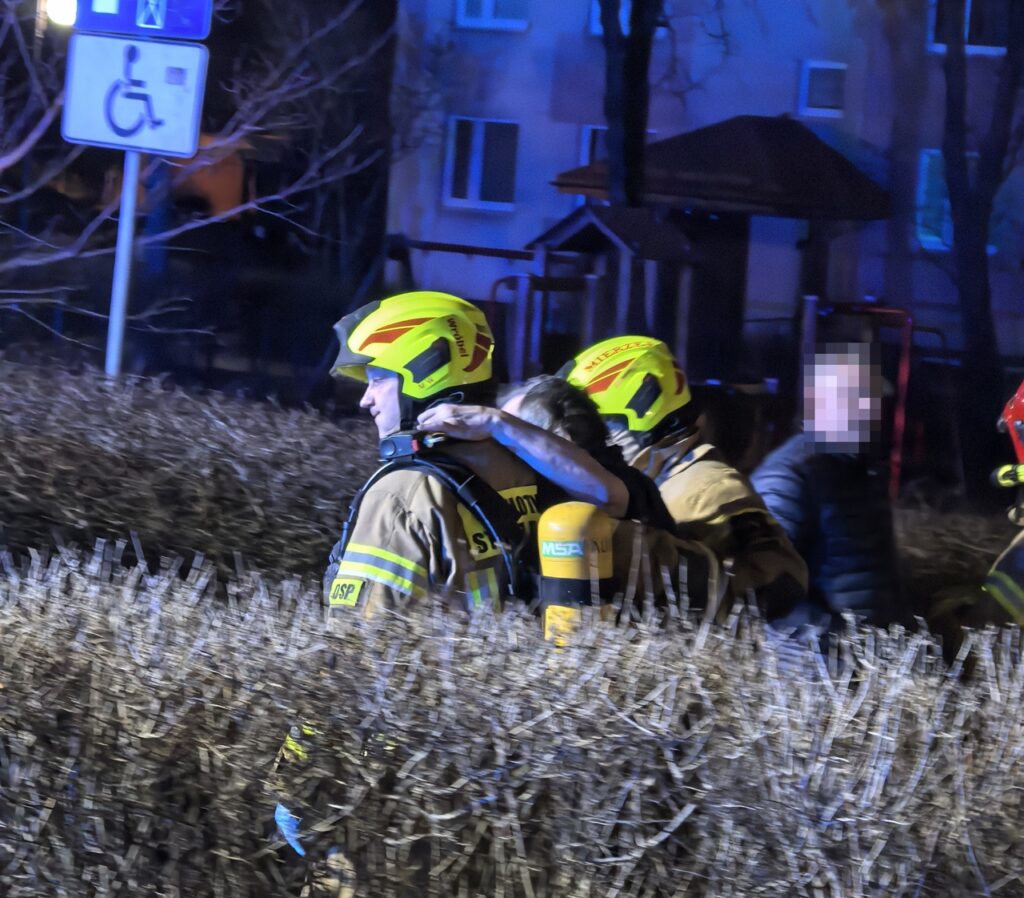 W mieszkaniu znajdowało się dwóch mężczyzn w wieku około 70 lat, obaj po udzieleniu niezbędnej pomocy trafili do szpitala. Odwagą wykazała się jedna z sąsiadek, która poza wykonaniem telefonu na numer alarmowy ryzykowała własne życie i ewakuowała jednego z mężczyzn z płonącego mieszkania.