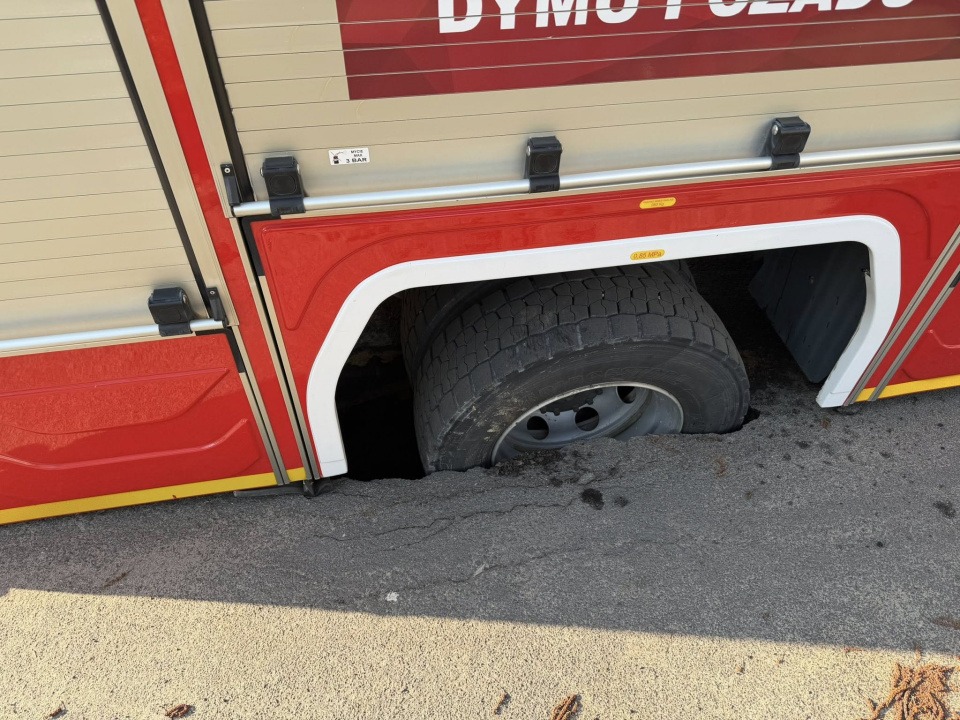 Na ulicy Księdza Wajdy w Zawadzkiem pod ciężarem wozu strażackiego Państwowej Straży Pożarnej zapadł się przepust całkowicie unieruchamiając pojazd.