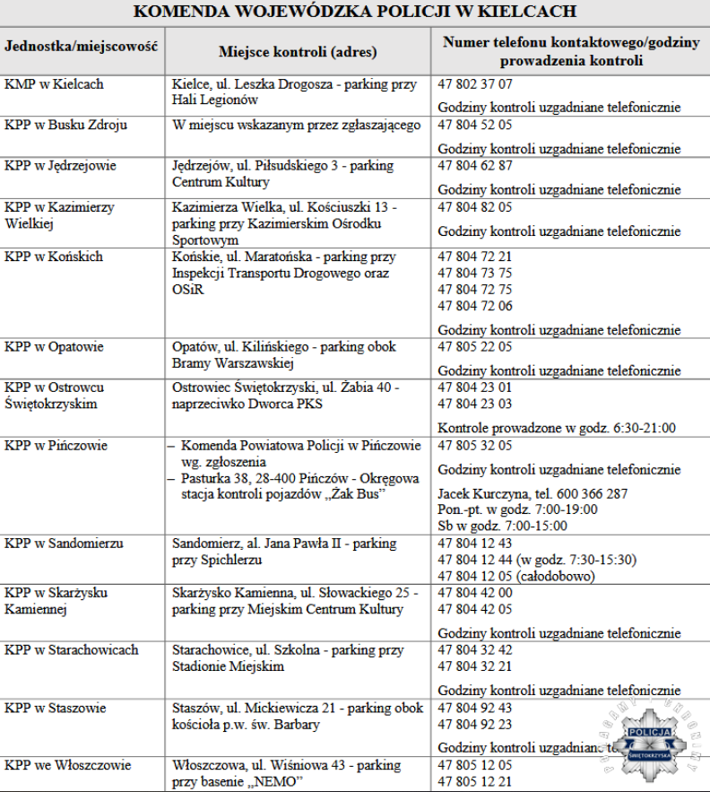 Stały punkt kontroli autokarów w Kielcach funkcjonuje na parkingu przy ulicy Drogosza 1. Listę wszystkich lokalizacji w powiecie można sprawdzić poniżej.