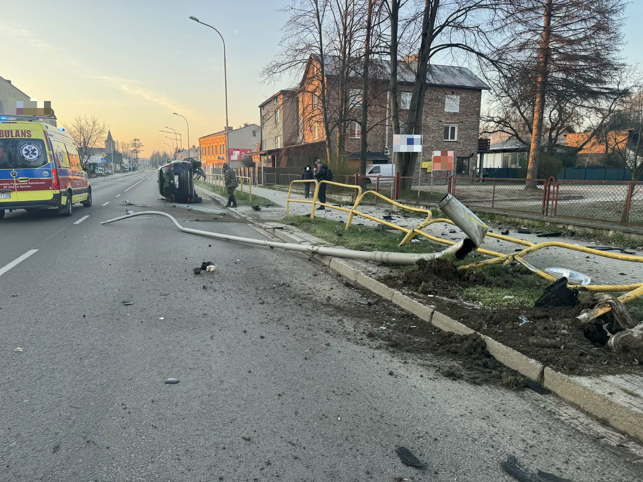 Do zdarzenia doszło wczesnym rankiem. Kierowca pojazdu stracił nad nim panowanie, uderzył w bariery ochronne, a następnie ściął latarnię uliczną. Ostatecznie samochód przewrócił się na bok.