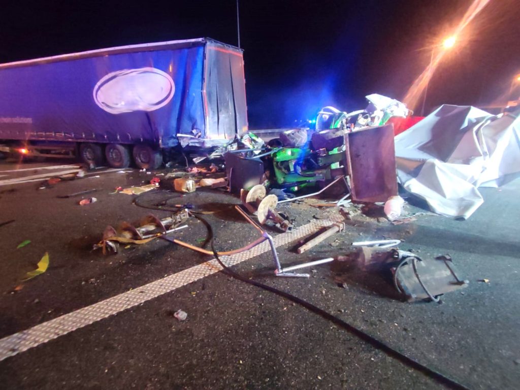 Samochód dostawczy, przewożący ładowarkę teleskopową, zderzył się z tirem. Pasażer auta dostawczego nie przeżył wypadku. Ranny kierowca tego auta został ewakuowany z rozbitego pojazdu przez świadków. W udzielaniu pomocy pomógł lekarz, który zatrzymał się w miejscu zdarzenia.