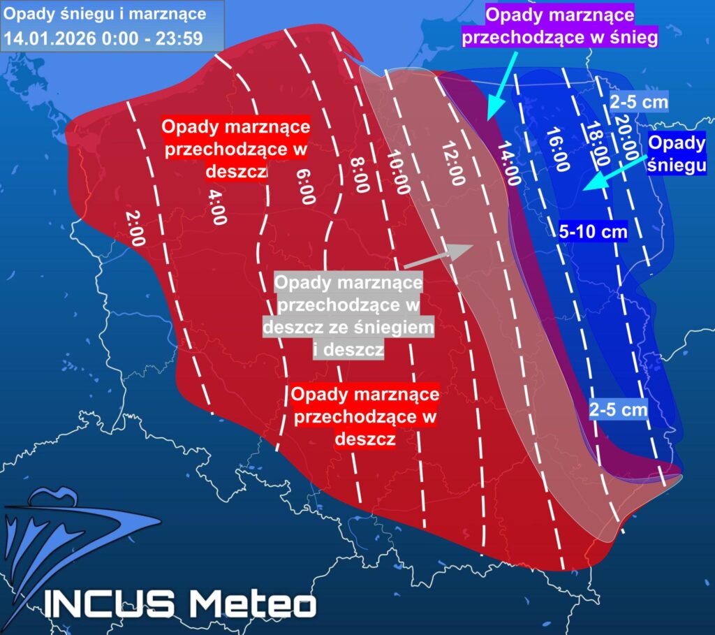 Do rana marznące i zamarzające opady mogą pojawić się między innymi w Szczecinie, Gorzowie Wielkopolskim, Koszalinie, Poznaniu, Pile, Lesznie, Wrocławiu, Opolu, Słupsku czy Bydgoszczy. Z biegiem dnia będą one występować dalej na wschód, obejmując między innymi Warszawę, Kraków, Gdańsk, Katowice, Łódź czy Kielce. Z kolei na wschodzie kraju spodziewane są opady śniegu – miejscami mogą przynieść dodatkowe 10 cm pokrywy w ciągu kilku godzin.