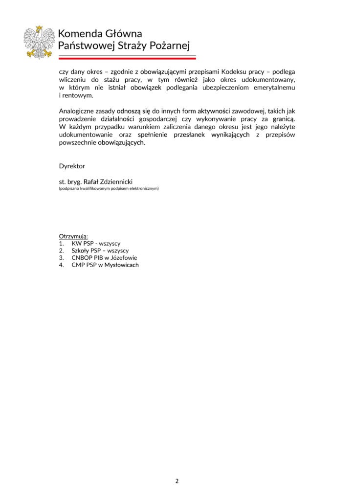 […] przy ustalaniu wysługi lat funkcjonariusza PSP nie jest zasadne automatyczne wykluczanie zaliczenia danego okresu wyłącznie z uwagi na brak odprowadzania składek na ubezpieczenia społeczne. Decydujące znaczenie ma to, czy dany okres – zgodnie z obowiązującymi przepisami Kodeku pracy – podlega wliczeniu do stażu pracy, w tym również jako okres udokumentowany w którym nie istniał obowiązek podlegania ubezpieczeniom emerytalnemu i rentowym – napisało Biuro Kadr KG PSP.