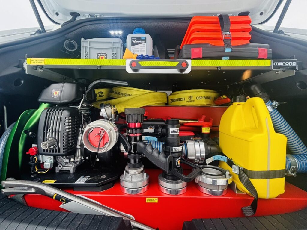 Samochód jest wyposażony w agregat wodno-pianowy o wydajności 240 litrów na minutę ze zbiornikiem wody o pojemności 280 litrów i zbiornikiem środka pianotwórczego 10 litrów, zestaw ratownictwa medycznego, drabinkę ratowniczą, armaturę wodno-pianową, pilarkę, podręczny sprzęt gaśniczy, pachołki, dyski sygnalizacyjne, wyciągarkę, łom, detektor prądu przemiennego, dron z kamerą termowizyjną wraz z monitorem dla operatora, sprzęt oświetleniowy i łączności.