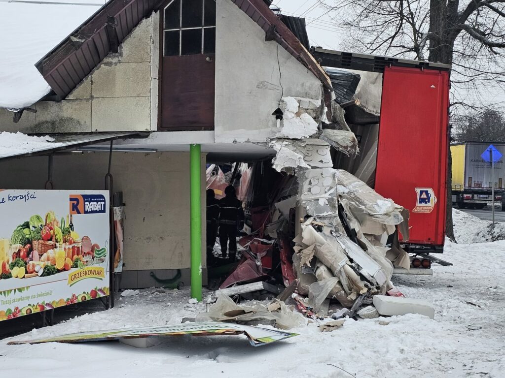 Ze wstępnych ustaleń policji wynika, iż kierujący ciężarowym MAN-em podczas wyprzedzania innej ciężarówki uderzył w stojący na drodze podporządkowanej osobowego opla. W wyniku zderzenia mężczyzna stracił panowanie nad zestawem, wypadł z drogi i uderzył w budynek sklepu, w którym na szczęście nikogo nie było.