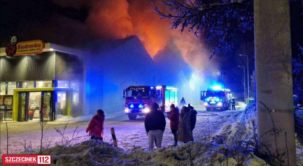 W nocy z czwartku na piątek w Polanowie spłonął sklep Biedronka. Na miejscu działało blisko trzydzieści zastępów straży pożarnej.
