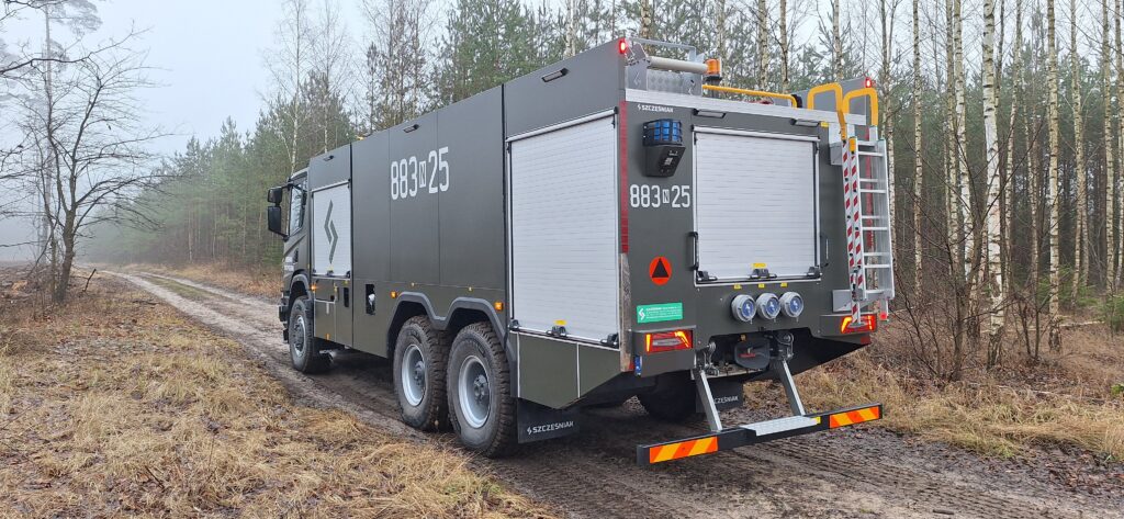 Samochód został zabudowany przez firmę Szczęśniak na trzyosiowym podwoziu Scania P450 6×6 XT.