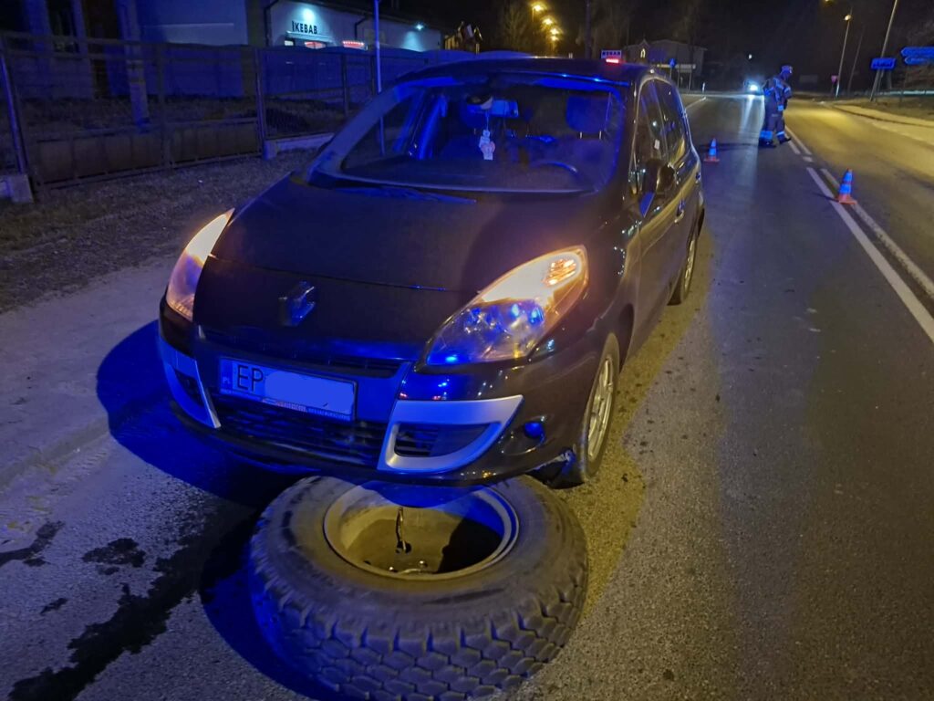 Na jedno z kół najechał kierowca samochodu osobowego Renault. Na szczęście nikomu nic się nie stało.