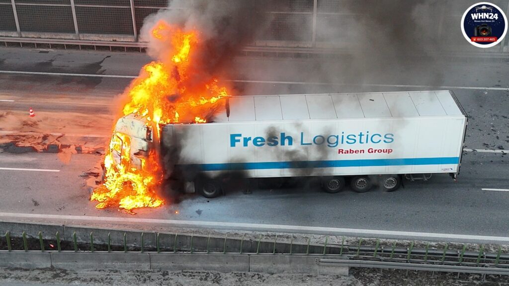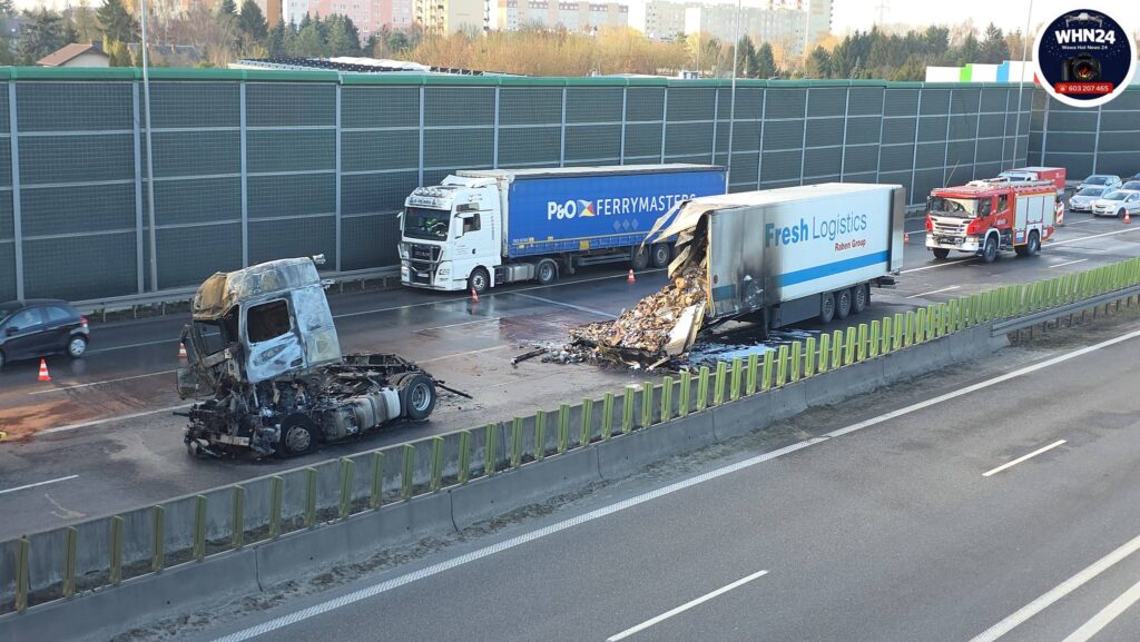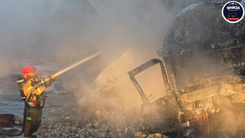Do kolejnej niebezpiecznej sytuacji doszło w trakcie usuwania zniszczonych pojazdów. W jednej z ciężarówek wybuchł pożar, który gwałtownie objął ciągnik siodłowy i część naczepy.